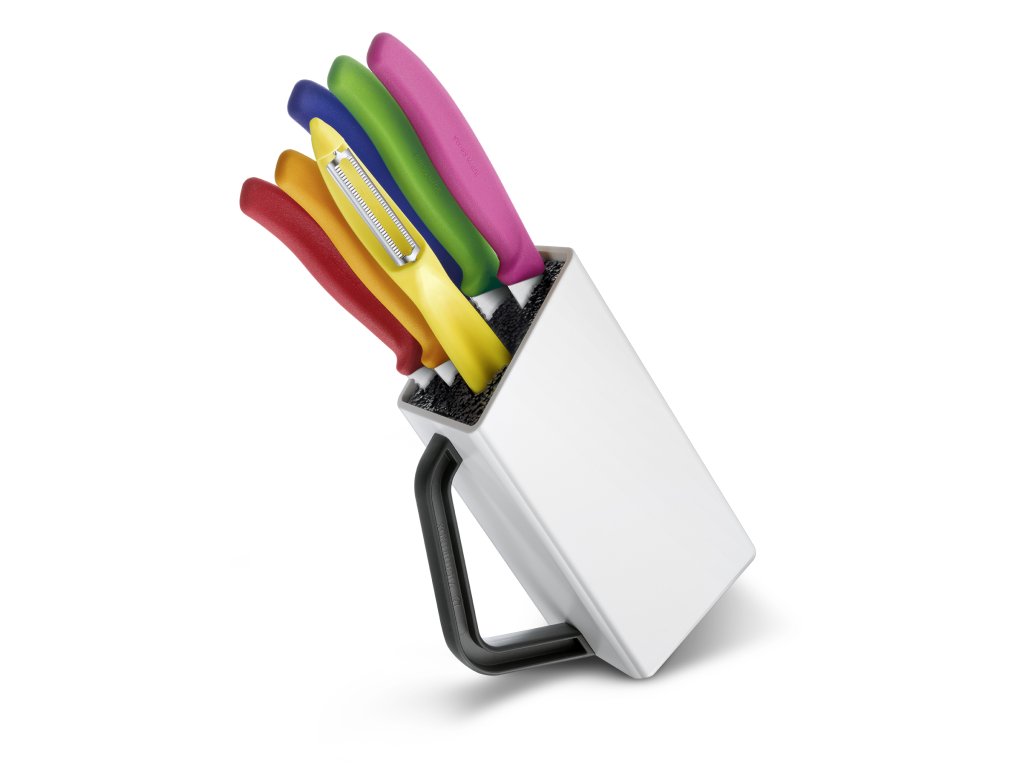 Kuchařští profesinálové používají různé barvy nožů na různé druhy potravin. Jedna barva na cibuli, jedna na krevety, jiná na steaky a pečivo. Nyní máte možnost pracovat stejně i u vás doma. Blok, který získal cenu za "Inovaci kuchyně 2014" vnese do vaší domácnosti organizaci a čistotu. Funkčnost a nadčasový design dělá z tohoto praktického pomocníka opravdového představitele švýcarské preciznosti.
