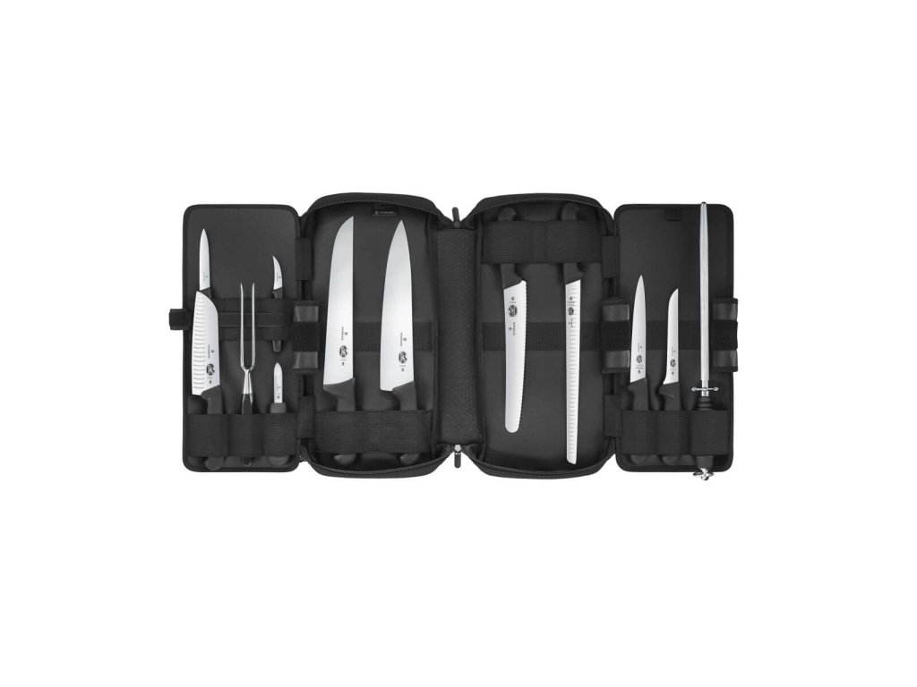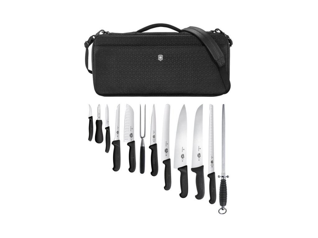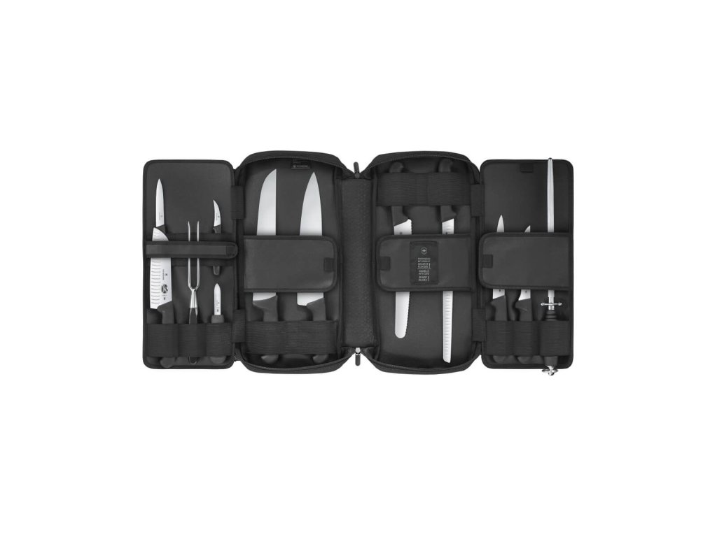 Kolekce Chef's nabízí dokonalé mobilní řešení pro ukládání kuchyňských nožů. Je navržena tak, aby vydržela náročné podmínky a rychlé tempo života šéfkuchaře, a každá její součást je vyrobena z vysoce odolné tkaniny nejvyšší kvality. Pořadač na nože je dostatečně pevný, aby odolal ostřím a hranám nožů, zatímco silná elastická poutka a popruhy na suchý zip udržují vše bezpečně zajištěné na svém místě, i když jste právě na cestách. Pořadač je dodáván s 12 kuchařskými noži a nástroji.