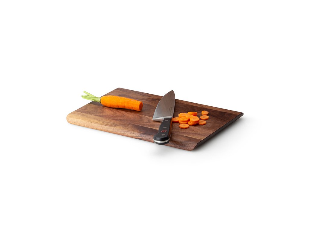 Krájecí prkénko z obzvláště tvrdého a vznešeného, masivního ořechového dřeva s krásnou strukturou a přírodním zbarvením. Každý kus je jedinečný. Zajímavě řešené kratší hrany desky s efektním zkosením.