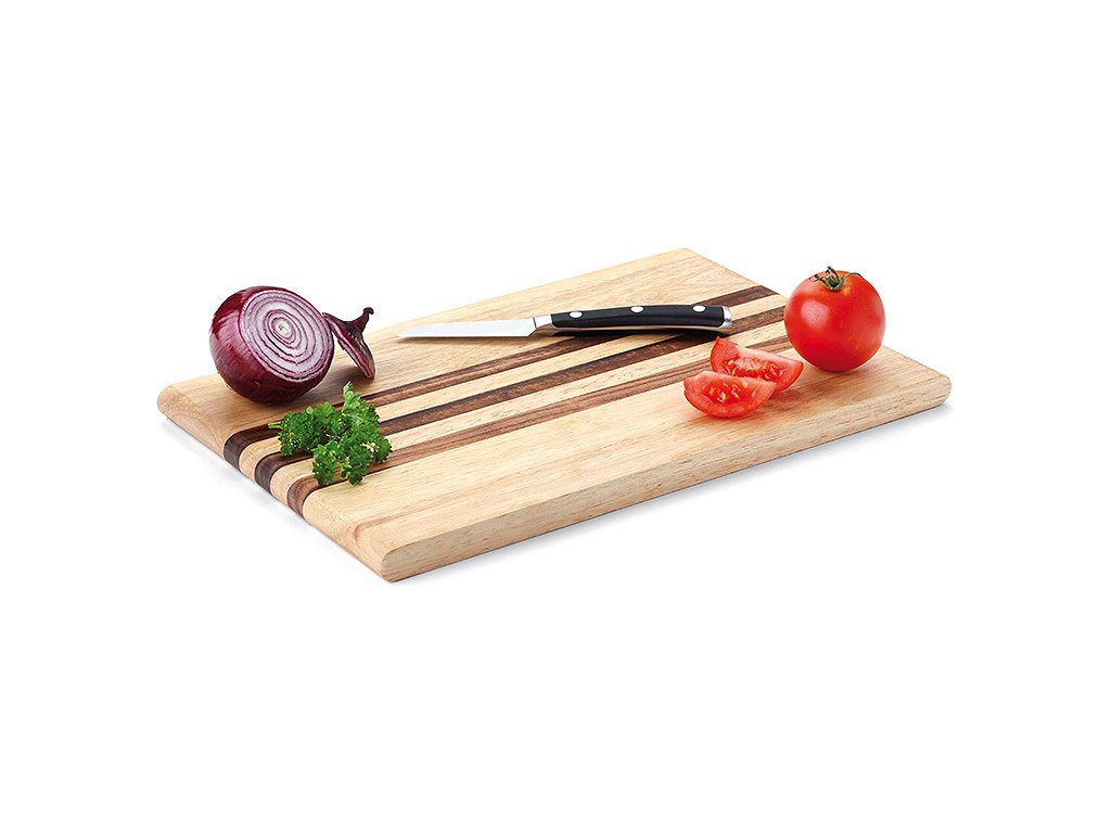Krájecí prkénko z kvalitního tvrdého dřeva z udržitelných zdrojů. Tři pruhy z tmavého akáciového dřeva efektně kontrastují se světlým dřevem gumovníku. Oblé hrany kratších stran prkénka dotváří celkový nevšední design.