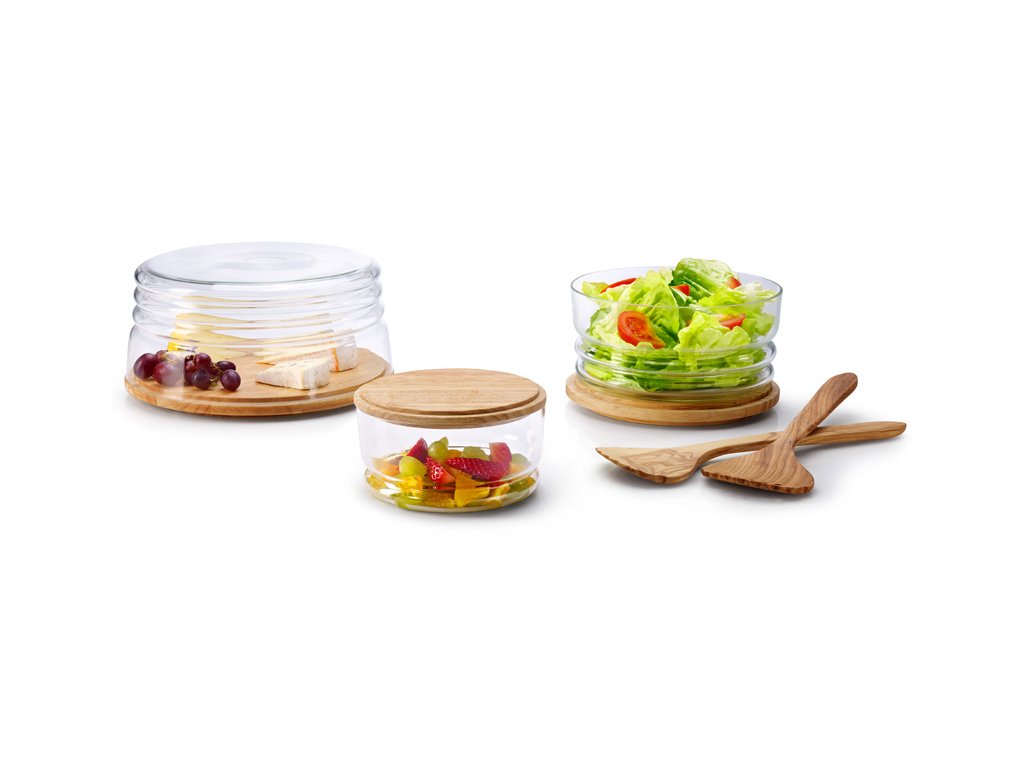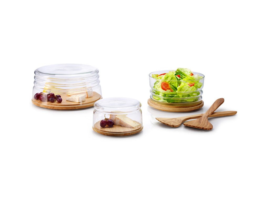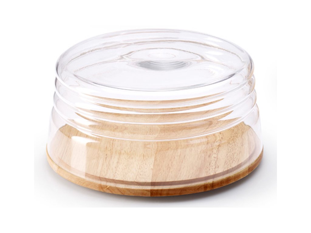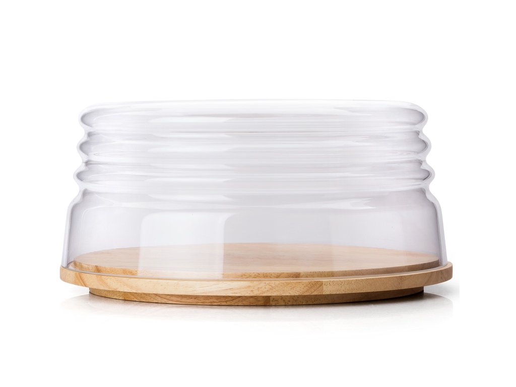 Kulaté prkénko z gumovníkového dřeva s transparentním poklopem z ručně foukaného skla je ideální na servírování a uchování sýrů. Díky inovativnímu tvaru poklopu jej lze použít také jako servírovací misku.
