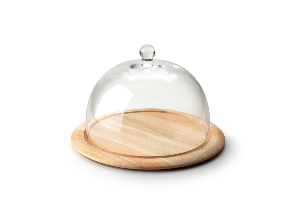 Kulaté prkénko z gumovníku s transparentním poklopem z ručně foukaného skla je ideální na servírování a uchování sýrů.
