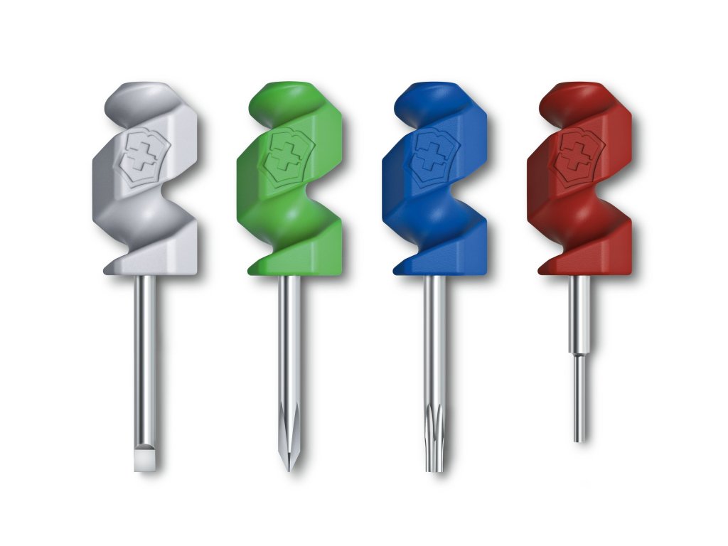 Praktická sada nástrojů, kterou ocení každý, kdo během dne již někdy potřeboval dotáhnou miniaturní šroubek u brýlí, nebo vyjmout SIM kartu z mobilu. Šroubováčky, které během okamžiku nasadíte do vývrtky vašeho armádního švýcarského nože. Tato sada rozšiřuje možnosti nože Victorinox o další čtyři funkce. Patentováno firmou Victorinox v roce 1983.