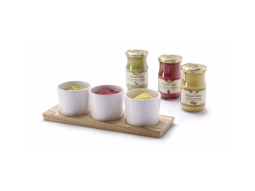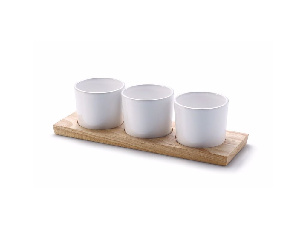Servírujte stylově dipy, salsu a omáčky v keramických miskách na dřevěném podnose. Každou mističku lze naplnit jinou příchutí a díky podnosu se zářezy vše bezpečně odnesete najednou.